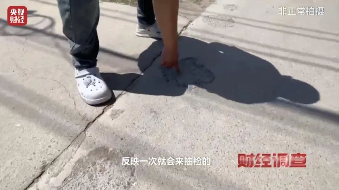 在刘家社区主干道的十字路口处,记者还发现了一处奇怪的区域,水泥地面上每隔一米便会出现大小不一的圆形破损,沿道路至少有十几处。村民们和记者说,这就是刘家社区应付上级检查和工程质量检测使用的专用地块。只要村民向上反映问题,就会专门领到这里来抽检,原因很简单,因为只有这里的水泥质量和厚度是达标的。